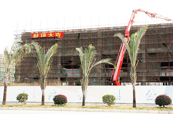 2010年11月29日上午十時三十八分,伴隨著震耳的爆竹聲,巨臂泵車將最后一車砼漿澆注在2#標準廠房樓頂,標志著2#、3# 4.7萬平米標準廠房全面如期封頂,為重大項目入駐奠定了基礎(chǔ)。
