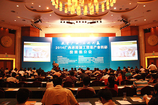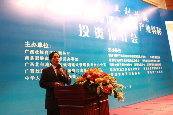 2014年7月16日,由自治區(qū)商務(wù)廳主辦的2014廣西承接加工貿(mào)易產(chǎn)業(yè)轉(zhuǎn)移投資推介會(huì)在深圳舉行。自治區(qū)政府副秘書長(zhǎng)魏然,深圳市經(jīng)濟(jì)貿(mào)易和信息化委員會(huì)副主任高林等領(lǐng)導(dǎo)和嘉賓為會(huì)議致辭。自治區(qū)商務(wù)廳、北部灣辦分別從不同角度對(duì)廣西承接加工貿(mào)易產(chǎn)業(yè)轉(zhuǎn)移投資環(huán)境進(jìn)行了推介。北海、欽州、梧州、南寧四個(gè)國(guó)家級(jí)加工貿(mào)易梯度轉(zhuǎn)移重點(diǎn)承接地,欽州保稅港區(qū)、憑祥綜合保稅區(qū)、北海出口加工區(qū)、中馬欽州產(chǎn)業(yè)園、東興國(guó)家重點(diǎn)開發(fā)開放試驗(yàn)區(qū)、南寧高新技術(shù)產(chǎn)業(yè)開發(fā)區(qū)、中國(guó)電子北海產(chǎn)業(yè)園、梧州市粵桂合作特別實(shí)驗(yàn)區(qū)八個(gè)重點(diǎn)園區(qū),分別就各自的產(chǎn)業(yè)布局、投資環(huán)境、政策優(yōu)勢(shì)進(jìn)行了推介。香港特區(qū)政府駐粵辦、香港貿(mào)易發(fā)展局、深圳外商投資企業(yè)協(xié)會(huì)、深圳臺(tái)商協(xié)會(huì)、深圳市加工貿(mào)易企業(yè)協(xié)會(huì)、深圳市企業(yè)聯(lián)合會(huì)、深圳市電子行業(yè)協(xié)會(huì)及廣東各類加工貿(mào)易企業(yè)約400人出席了推介會(huì)。